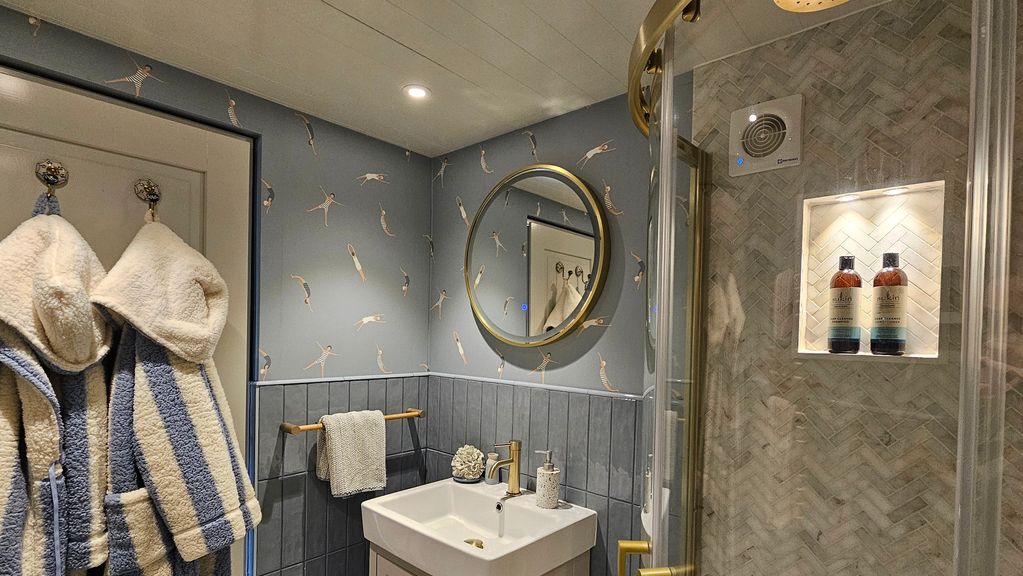 We designed a bathroom that combines a playful retro charm with sophisticated modern touches. The fun vintage swimmers-inspired wallpaper sets the tone, featuring soft pastel tones and Victorian swimmers that transport you to a nostalgic poolside scene.